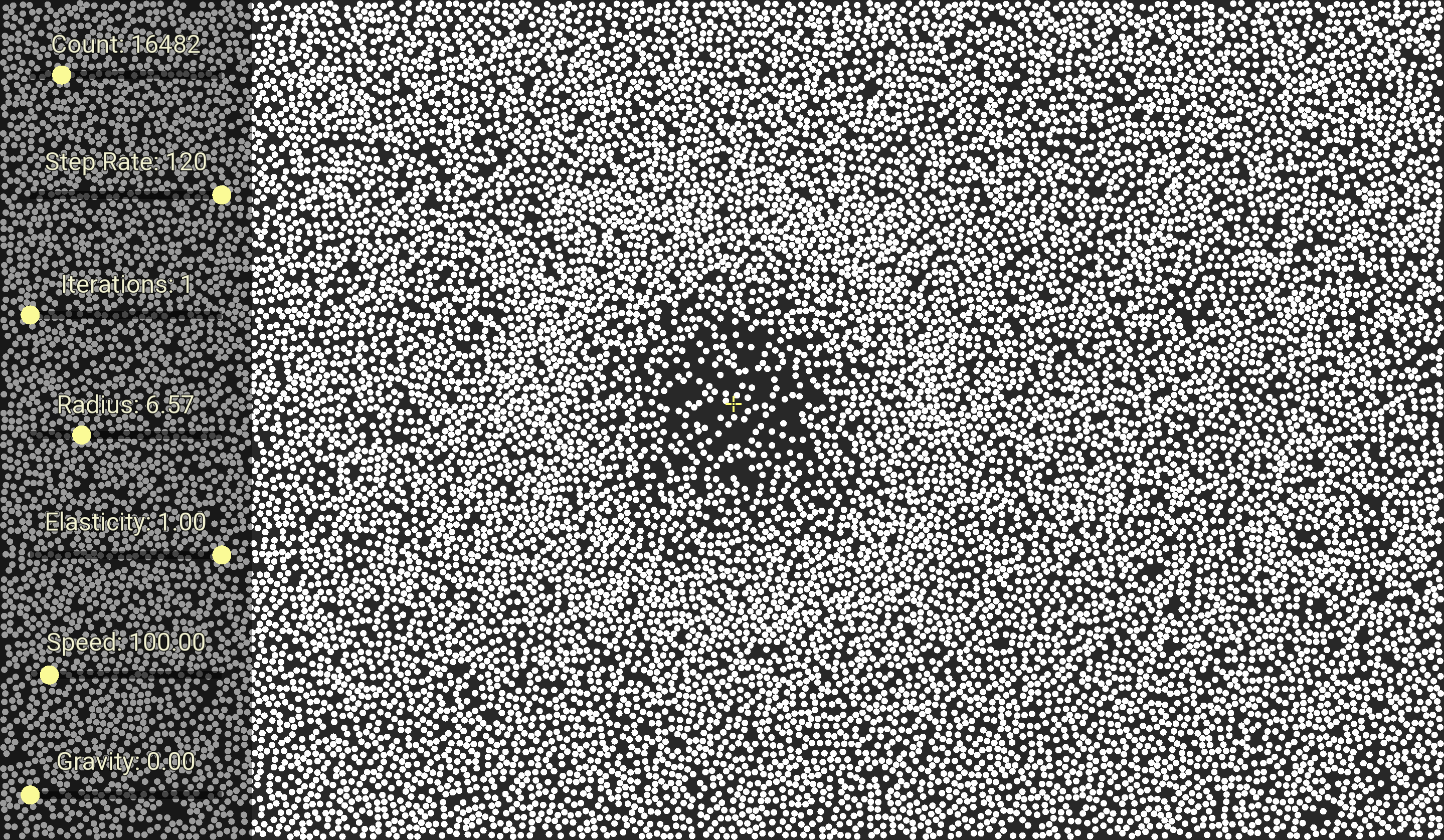 Standalone executable which can run a real-time particle collision simulation with various configurable simulation properties. Powerful processors are able to run the simulation with a larger amount of particles and step rate.