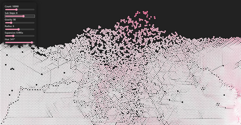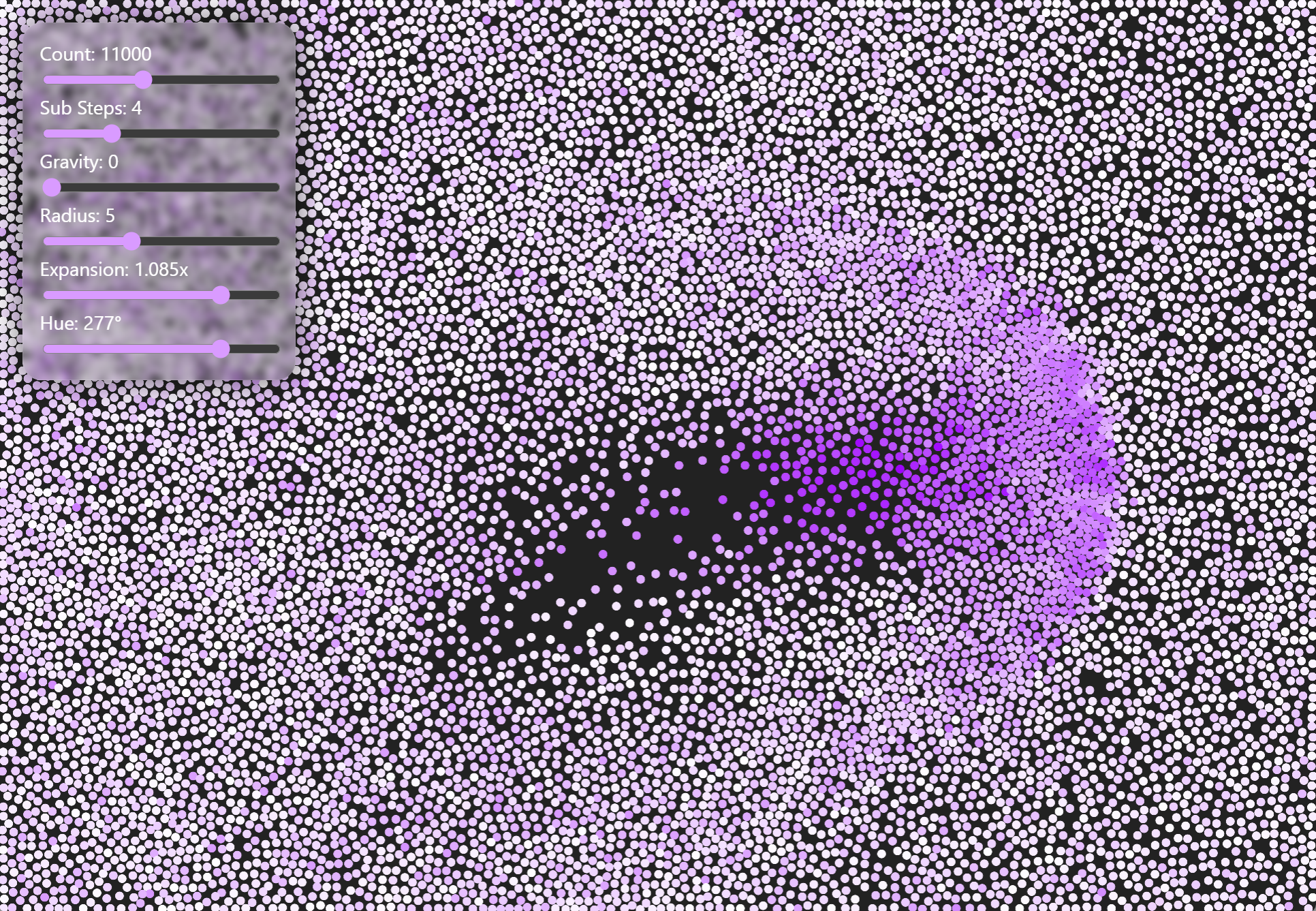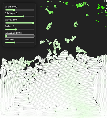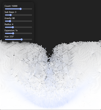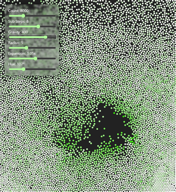 Simulate up to 25,000 particles in real-time with a position-based solver using Verlet integration and a uniform grid broad phase to eliminate particle pairs. The solver does not conserve energy or momentum, and should not be used as a tool for understanding dynamics in the real world. Instancing with WebGL is used for efficient rendering of thousands of particles.